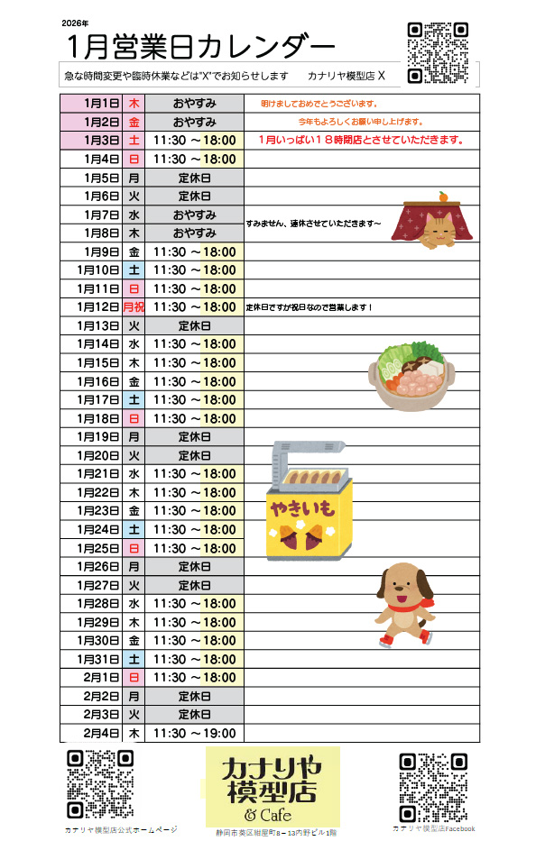 ■店舗概要■店舗名:カナリヤ模型店&Cafe 静岡市葵区紺屋町8-13内野ビル1階 google map054-293-6661 キャッシュレス・インボイス制度対応 11:30〜19:00 定休日: 月・火※日曜日は、18:00 閉店 店主 山田明子(ゴム動力舎)