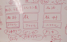 夕方になり、私が買ってきた塗料を見ながらまた塗料の話に。 「結局、タミヤカラーってどれのことですか?」 「タミヤの塗料全部。」 「じゃぁ、今回の場合は何を基準に、種類を選べばいいんですか?」 「好きなように選べばいい」 「だからぁ〜〜〜、何を基準に好きか嫌いか選べばいいのかわからないんですってば・・・。」 「さっきからアクリルのことをアクリル系だと勘違いしてるみたいだけど、アクリル系というくくりはないよ。アクリルは他の種類の塗料にも入ってる。溶剤が違うんだ。」 「ラッカー系、アクリル系、エナメル系があるのかと思ってたんですけど違うんですか?」 「う〜ん、分からないかなぁ〜」 「えぇ・・・全然わかりません・・・。」 結局、ホワイトボードの前に移動して図解入りでの塗料講座が始まった。