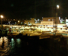 さて、探検だ。もう大浴場は開いているらしい。2人部屋とか、4人部屋とか、大広間とか、全ての部屋タイプを覗きに回る。個室の人以外、だいたい開けっ放しなんだね。大広間では、熟年夫婦のすぐ隣で酔っぱらったおじちゃんがイビキをかいて寝ている。男女別々なんてことはないんだ・・・女性専用スペースはあるらしいけど、やっぱり(うら若き!)私にはまだ「早い」な、大部屋は。 ついに出港。期待は高まり、そして、だんだん南港が遠くなっていった・・・。