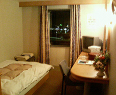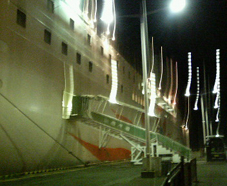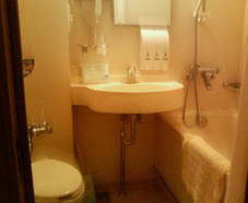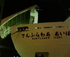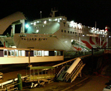 乗船名簿に記入して、さて、乗船だ。 想像以上に大きな船は、車を載せる為パックリと鉄の板の口を開けていて、その微妙なカーブにマシーネンに通じる雰囲気を感じた。個室に入ると、そこはまるでビジネスホテルのシングルルーム。何でもあった。 部屋の隅から説明すると、スリッパ、窓にカーテン、絵画、予備の毛布、浴衣、荷物置きの台、テレビ、湯沸かしポット、お茶セット、冷蔵庫、コンセント、鏡、ライト、ベッドに羽布団に枕、アラーム時計、各種パンフレット、ハンガー、筆記用具、ニオイ消しの炭の置物、ティッシュ、懐中電灯、もちろんバスとトイレ、ドライヤー、シャンプー、リンス、ボディーシャンプー、花柄のトイレットペーパー、便座クリーナー、掃除道具、歯ブラシ、フェイスタオル、バスタオル、足ふきマット、・・・etc. ビジネスホテルと違うのは、・・・救命胴衣! あぁ、タイタニックな気分。 毎回オゾン脱臭をして、そのオゾンを回収している(どういう意味だろう?)ということで、ニオイもなく、居心地良い。満足だ。。。 電波が届くうちにあちこち連絡を取り、その間に船のエンジンがかかった。震度1ぐらいの振動が続く。スクリューが回っているところを見たいな〜と思うが、それは叶わぬことだ。