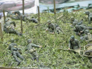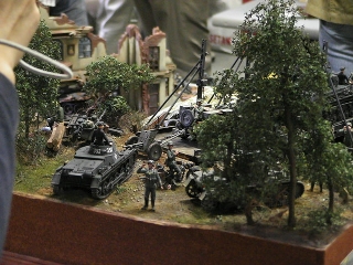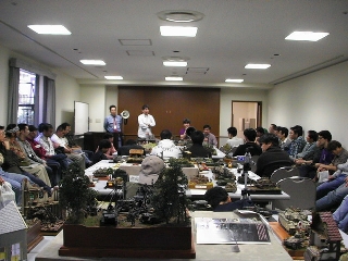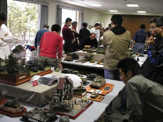 トークと表彰の終了後、やっと作品をゆっくり見て回ることができた。雑誌で見る作品もいくつかあり、見応え充分。九州の作品は色が違うよ、と聞いていたけれど、本当にそうだった。ゆっくり見ては歓談し、騒いではまたゆっくり作品を見る。ジオラマ大好きな私は、置いてあるだけではわからない技とか、仕掛けとか、その作者に作品を説明して貰うのがとても楽しい。 会場では多くの男性モデラーの中に女性モデラーのきららさん発見。やっぱり、素敵な人だった。お洒落な姿だった。私は前日は息子のトレーナー、その日は、インド綿の安いブラウスに、ジーンズ。もちろん運動靴・・・。 「やっぱり、女はスカートにブースだな。」と横浜組にいじめられ、パンチでお返しした。でも、その通りだと、密かに反省。 (しかし、久しくスカートに無縁・・・。ファスナーの閉まるスカートが・・・たぶんもう無い) 九州のきららさんも、静岡からのチエミ丼も、東京からのミカリンも、みんなちゃんとしたモデラーで、私はジオラマ見るのが好きなだけの人だ。自分の作品が無いということに焦燥感を感じつつ、目の保養、目の保養。 とにかく作品を見るのが楽しい! 今回はいっぱい写真を撮ったつもりが、ほとんど人の顔だった。(笑)