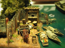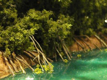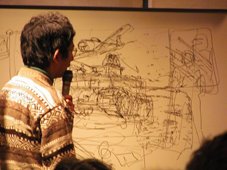 ひゃぁ〜、ゴメンナサイ。あの宴会は70人だったっけ。(^_^; 失礼をお詫びし、快く写真の掲載を許可して頂けたので、よかったよかった。そのために育てたという2年物の植物の根っこが作品の質感をぐっと高めていると思った。水面の作り方とか映り込みの効果とか、作者ご本人に解説をして頂く。展示会での至福の時間だ。