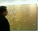スタジオでは念願の新作「男たちの大和の撮影セット」のジオラマも見せて頂いた。すごいの一言。目がしょぼしょぼするぐらい細かい。行った人が見たら大うけ間違いなしの情景がリアルに再現されていた。 隠れキャラがお二人、山の上と崖の途中に。さて、どなたとどなたかな〜♪ ご本人は必ずコレを読んでニヤリとしているに違いない。 金子先生に「GEISAI」の村上隆さんの話をしたら、「最初に見た彼の作品が凄くてね」、というお話に。話を伺っているうちに、 「あ、その作品、今日見ましたよ、GEISAIで!」 「え!ほんと〜?!」 それが、この写真。 大きな壁面に挿してあるこの白いの、実は全部タミヤのアメリカ兵フィギュアなんですって。凄く印象的な作品だったので、私も覚えていたわけ。