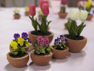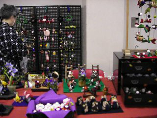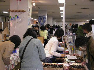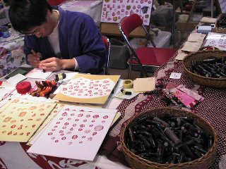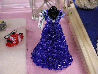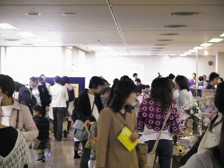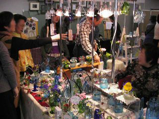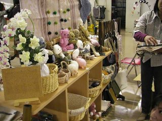 ビーズのペンダントを買いました。ココをご覧のみなさんもお忘れのようですが、やっぱり私も女性なのです。 綺麗なものにウットリしてしまいました。アクセサリの中に素敵なロイヤルブルーのビーズのミニチュアドレスが。さすがに手もかかり、材料も高価なもの、欲しいといってすぐに買えるものではありませんが、でも、これもほしぃ〜! 素敵なハンドバッグも見付けました。 明日売れてなかったら絶対買うぞ。実は朝から売約済みにしてもらいたい気持ちを堪えているの。店の看板になっているような目立つ商品はやっぱり買っちゃいけないんだ・・・・主催者のタシナミとして。 ミニチュアのねんど細工も買いました。凄く小さいのに、キレイ。私が買ったのはピンクのパンジー。こう見えても1円玉よりちょっと小さいぐらいのサイズです。ミニチュアのもの、各地のイベントでちょっとずつ買い続けています。(いつかドールハウスを仕上げるために。) 手彫りのハンコ屋さんでは、自分で好きな形の枝を選んで好きなように掘ってもらいます。だから断面がまん丸じゃないのがまた味があって大人気。いつも人だかりでした。私は「ゴム動力プラ子」でオーダー。その文字数と画数の多さはかなり挑戦的だったらしく、職人さんもちょっと燃えたようです。