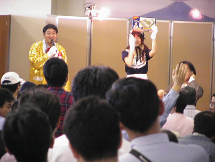 出展者さんも良く売れたみたいだった。商品がなくなっちゃって前日に取りに帰った方もいらした。 それから突発的に(?)モリナガ・ヨウ先生が絶妙トーク付きでサイン会をやって下さったこともあり、プラコバッグも良く売れた♪ 忘れてならないのが、アルバイトをお願いした女子大生2人。とても真面目で可愛らしく好感度抜群♪若い子と話をするのも楽しいねぇ〜。 「私、わさびダメなんです・・・」 「か〜〜わいぃぃぃなぁ〜〜」 おじさん達もメロメロ。モリナガ先生もサササと似顔絵を描いてあげたりして、早くも彼女たちは知らないうちに「上がり」なのだ!? もちろん、「来年も宜しく!」「もちろんです!」とニコニコ、 記念写真撮りまくった。 どたばたと撤収が終わり、その日遠く高知から駆けつけて下さった海洋堂御一行様、モリナガ先生と楽しく夕食を取り、静岡駅でお見送りをしてお祭りは終わった。 あぁ、・・・ホントにおわっちゃったねぇ・・・