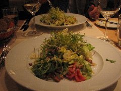 前菜のサラダは、密閉した瓶に入った生野菜をその場でシェイクして和え、お皿にばさっと。これで一人分。 マクドナルドにも同じ方法のメニューがあるけど、全然ちがいます。(笑)