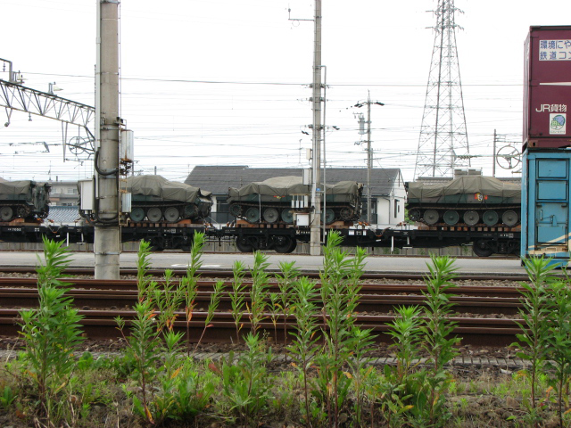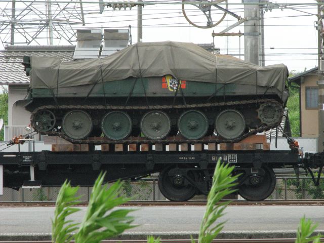 なんかのマークが、チラリ。 連結待ちの静かな時間が流れていた。ねぇ、どこから来てどこへ行くの?薄曇りの蒸し暑い風になびく雑草が、妙に哀愁を感じさせた。 ■■■ 事務所に戻り、しばらくすると14号車さんからすぐに下記のような情報が入った。 ================= 名称:73式装甲車 所属:不明 車種は「装甲兵員輸送車」で間違えないのですが、制式呼称には「兵員輸送」は付かない様です。 参照:【http://www.mod.go.jp/gsdf/html/soubi/bottom/syaryou/kaisetu/73soko.html】 部隊マークはどうやら師団マークでは無く連隊かそれ以下のマークの模様。 軍配をモチーフにしたマーク、見覚えはあるのですが、加齢の為、何処の部隊か思い出せませぬ。 本業の陸軍様にお尋ね下さい。 帰りに再度通過しましたが、もうありませんでした。 即応しておいて正解でしたな そして、その後、タスカのY田さんから、下記のような情報が。 ============== このマークは第8師団の第8戦車大隊のマークですね。 軍配のように見えるのが兜の角(って言うのか?)で、その間に虎の顔が描いてあります。背後の赤の帯が2本線に見えるので第2中隊の本部付き車輌ということだと思います。 部隊は九州の玖珠駐屯地に第4戦車大隊と一緒に駐屯してるはずですが、輸送中の車輌が73式だけだとすると、演習で移動中というよりも相模原の三菱重工で修理か整備で送られた帰りかも知れないですね。