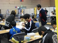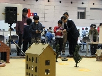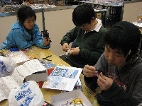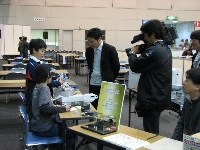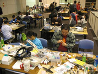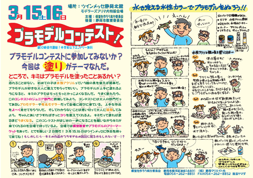 前回好評だった「モリナガさんの似顔絵コーナー」が、今回はなくて残念。またお時間を取って頂いて、出店して頂きたいものですね! そうそう、土曜の夜は今回も懇親会でわいわいがやがや、田宮社長や海洋堂宮脇社長を交え、多くの出展者様にご出席いただき楽しく過ごすことができました。韓国からの皆さんもご招待しましたが、通訳で来ていた女学生の流暢な日本語には2度びっくり。なにしろまだ半年ぐらい、っていっていましたからね、来日してから・・・!?アンビリーバブルですよねっ!!ローカルニュースの時間には皆でまた壁の上のテレビを見上げ、歓声をあげながらフリマとコンテストの模様を見ることが出来ました。 ■ コンテスト。 このチラシは市内の各小中学校の掲示用に1枚、そして、近隣小中学校には50枚ずつ配布をさせて頂いていたものですが、これはやはり「静岡市教育委員会後援」という名義を申請したからできたことで、その方法を教えて下さり、校長会にも連絡をとって下さった私の恩師には大感謝です。(それを口実に他にも沢山お話ができてうれしかったぁ・・・私を猿から人間にして下さった恩師ですからね。)それによりコンテストはフリマ部門と分けて「模型を作ろう実行委員会」を立ち上げ、運営したわけですが、ほんとにやってよかった〜〜、って思いました。これは第一歩ですが、二歩目に繋がる、って確信しました。