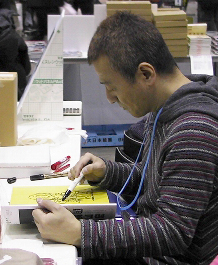 アートボックスさんのブースでは、マシーネンクリーガーの横山先生が、一人一人にイラスト入りのサインを。丁寧だ。スケビ(Scale Aviation)の連載を笑いながら読ませて頂いている私は、本が売り切れだったので、なんとスケビ専用バインダーのカバーにサインをお願いしてしまった。
