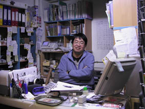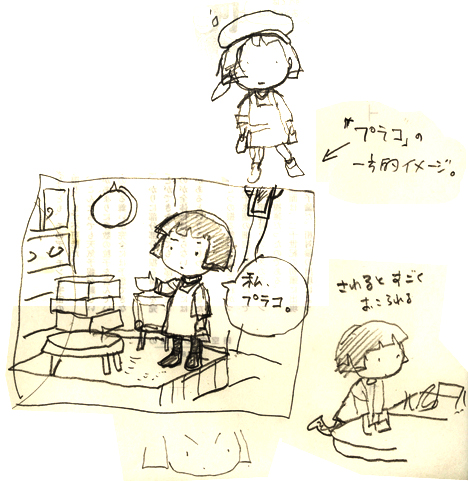 棚の下の方にはお取り置きのプラモが沢山おいてあった。その一部は「奥さん対策」らしい。いかに苦労して奥さんに見つからずに家にプラモを入れるか、お客さんは苦労している。いろいろなエピソードをお聞きして、ついつい笑った。 そんなに奥さんを怒らせたくないかなぁ? たとえば、玄関を開ける前に窓の外の手すりにプラモを挟み、手ぶらで帰宅。あとでこっそり取り込む。2箱分を1箱に詰め変える。車のトランクの中に全部しまう、等々・・・ 昔は大人がプラモを買うことが恥ずかしかったらしく、いつか子どもと一緒にプラモ屋さんに堂々と行ける世の中になってもらいたい・・・という願いすらあったのに(昔のタミヤニュースにその話が出ていたな〜)、今は、奥さん対策かぁ。いつの時代も苦労しますなぁ。 ・・・そんなに怒る事ですか?奥さん!あなたのあのしまい込んだハンドバッグ、プラモのいくつ分のお値段でしたっけ?昨日旦那さんが吉野家に並んでるときに、アナタはどこのレストランでランチしてました?と代わりに問うてあげたいね。(笑) でも、そんなこと言ったら、100倍ぐらい言葉が返ってきそうだね。しかも結婚前の些細な口げんかの原因ぐらいまでさかのぼったりするのさ。くわばらくわばら・・・ 地球堂さんを出るとまた、あのエレベーターが暗い廊下の向こうで口を開けて居眠りしてた。「お〜い、おはよう〜♪頼むよ〜」 ガタンガタンガタン・・・・ドシ〜ン 願いが通じ、無事、1階に。 たぶん、あのエレベーターは、生き物だ。 さて、その日に打ち合わせしたモリナガ先生から、ついにフリマのロゴマークが! これからは、そのマークをどんどん使って広報活動をしていきたいと思います。まずはモリナガ先生がそのロゴを描くに当たっての打ち合わせから、イメージしてださったものをお見せしますね。このイメージからどんなものが出来上がったのか、ちょっと想像してみてください。ちなみに「プラ子」と「プラコ」は別人ですよ。へへへ。