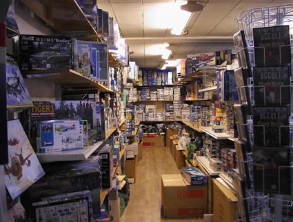 覚悟を決めて暗くて狭いビルの通路を入ってみた。ドキドキした。ビルの奥には緑色のエレベータが開いた状態で待機していた。まるで口をあけて気絶しているようだ。「起きてくれよ・・・。お客さんだよ〜。もしも〜し!」 ものすごい閉塞感を感じつつボタンを押すと、エレベータはガタピシャ体をねじるように上がって行った。そして、ガガガガドシ〜ンとかなり無理した様子で停まった。思わず声を掛けたくなる。「お疲れ様でした。無理させてごめんね♪」 飾り気の無いドアを開けると、ちょっと暗めの蛍光灯のなか、プラモデルが山積みになっていた。写ってないけどこの右側にも通路があるよ。