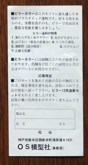 平成17年6月3日(金曜日) なんか気にかかってしまってねぇ・・・。 日本のどこかの古いプラモデルのキットの中に、40年間ひっそりと眠っている(はずの)ただの紙切れなのでありますが。 ・・・先日のピラーの推薦状のことなんですけどね。 なんというか・・・。好奇心の固まりの私が、このまま知らんぷりなどできようはずもなく、当然のように、ある方のお顔がチラリチラリと思い浮かぶわけで・・・。 結局、ピラーのことを書いたあと、「もしかしたらお持ちでしょうか?」と「田宮模型歴史研究室」の助手さんにメールを出しました。 でもね、そのお返事は、 「そのような推薦状は見たことがありません。これからも気をつけてみますが、難しいかもしれませんね。」 という内容でした。あぁ、そうかぁ。助手さんですら見たことが無いのなら、もう無いも同然、たぶん、極少数のロットに入っていたものなのかもしれないと、諦めることにしたプラ子なのでありました。 ところが、やっぱり、「田宮模型歴史研究室」は、「田宮模型歴史研究室」なのです。(以前にも、8の件でお世話になっております) さすがなのです。 5月29日 助手さんからメールが。 本日、某マニア宅にお邪魔して聞いてきました! 「これこれしかじかで、ピラーという塗料をご存知ですよね」 「ええ、もちろん!あの三角のアレでしょう?今あるのはこれかなあ〜」 (と、事もなげに塗料セットが出てくる) あせって画像を押さえたが、本日プラ子さんの日記を見ると惜しくも同じセットであることが判明、残念! 「ところで、タミヤとLSのキットにかくかくしかじかで『推薦状』が・・・」 「う〜ん、記憶に無いなあ・・・ちょっと待ってね。 あ、LSは『推薦状』という別紙じゃないけど組み立て説明書に印刷されてますね・・・」 「おお〜!」